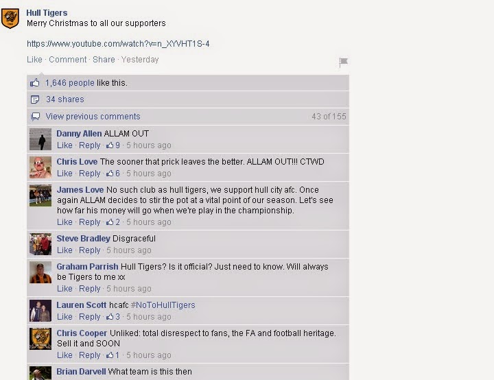 So it should be just a case of commenting upon a satisfactory victory, but no the club decided to kick it’s fans in the ankles today by renaming the Facebook page to Hull Tigers.